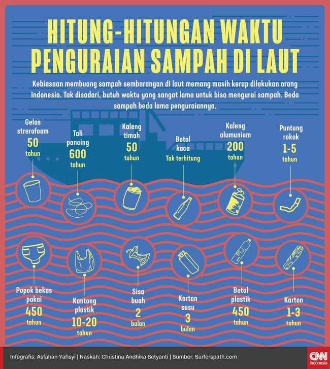 Jakarta, CNN Indonesia -- Kebiasaan membuang sampah sembarangan di laut memang masih kerap dilakukan orang Indonesia padahal butuh waktu yang sangat lama untuk bisa mengurai sampah.