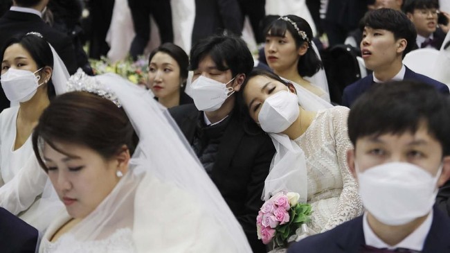 -- Ribuan pasangan bersama-sama mengucap janji suci sambil menggunakan masker untuk menghindari penyebaran virus corona Wuhan.
