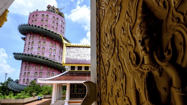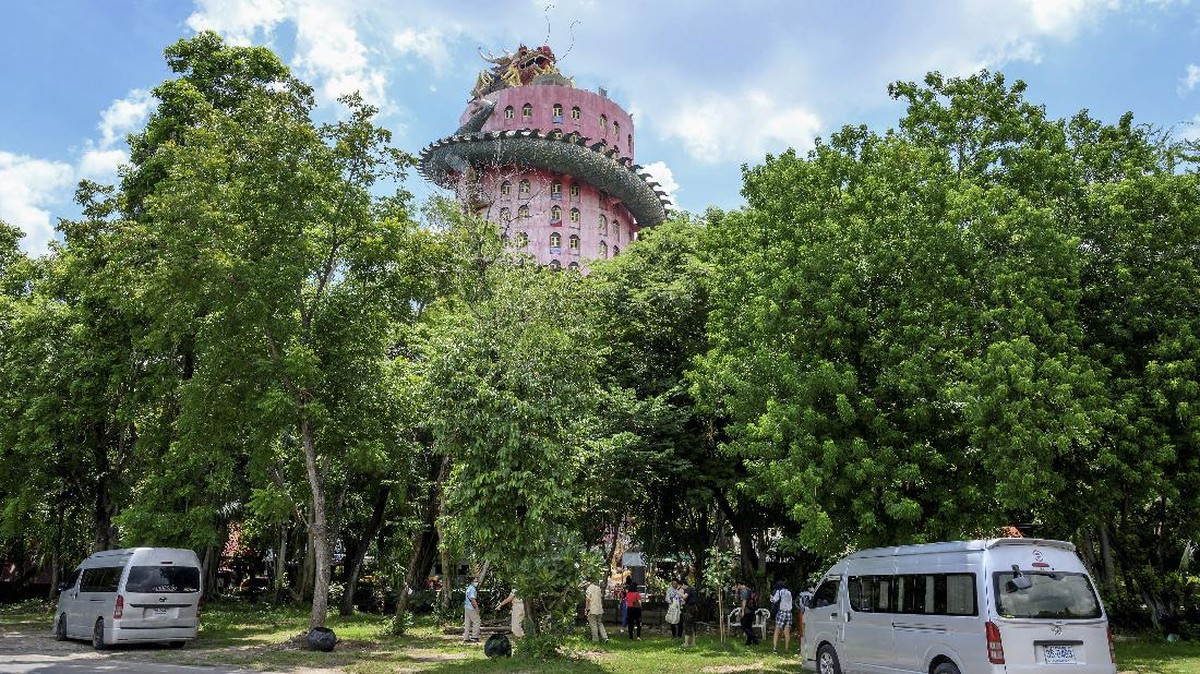 Jika sedang wisata di Thailand, sempatkan diri ke Kuil Samphran, tempat ibadah umat Buddha yang populer dengan patung naga melilit menara berwarna pinknya.