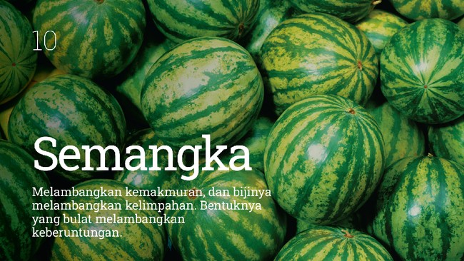 -- Buah-buahan memiliki simbol tersendiri untuk Imlek. Ada beberapa jenis buah yang melambangkan keberuntungan.