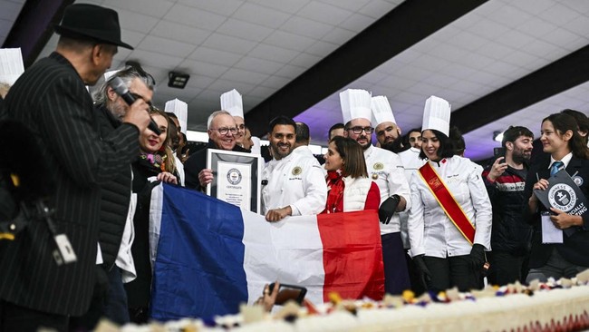 Sejumlah koki pastry di Prancis membuat kue stroberi sepanjang 121,8 meter pada Rabu (23/4). Kue diklaim sebagai kue terpanjang di dunia yang pernah dibuat.