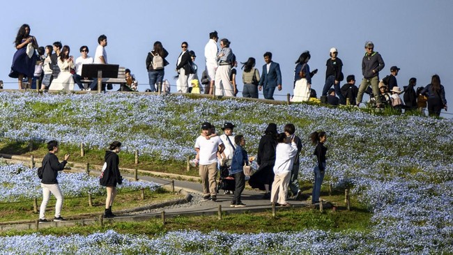 Jakarta, CNN Indonesia -- Di Hitachi Seaside Park, Ibaraki, Jepang, pengunjung bisa menyaksikan 5,3 juta bunga 'mata biru muda', yang juga dikenal sebagai nemophila saat mekar penuh.