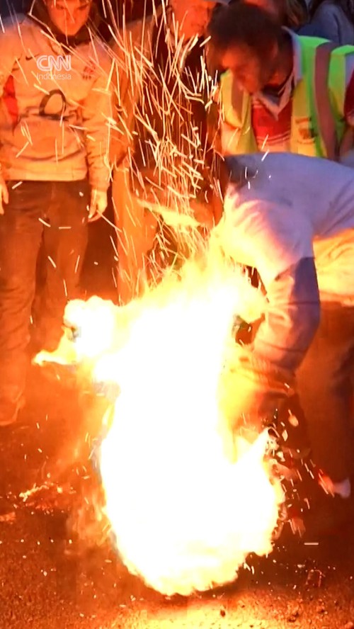 Ribuan orang memadati jalanan Ottery St. Mary, Inggris untuk menyaksikan tradisi menggulingkan tong tar pada Rabu (5/11).