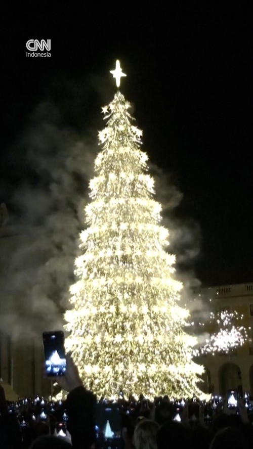 Para pengunjung bersorak saat pohon Natal raksasa dinyalakan, menandai dimulainya rangkaian perayaan.