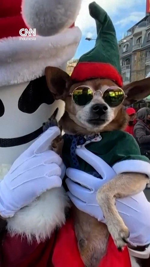 Puluhan anjing peliharaan milik warga maupun komunitas anjing setempat tampil mengenakan kostum khas Natal dalam parade tersebut.