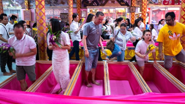 Beberapa kuil di Thailand punya tradisi tahun baru yang unik. Salah satunya adalah menyambut tahun baru dengan tidur di peti mati.