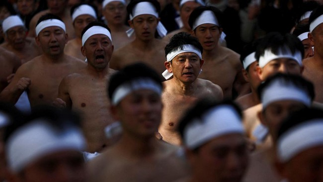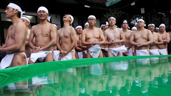 Para penganut Shinto melakukan ritual mandi es pada Minggu (11/1). Ritual ini bertujuan untuk membersihkan jiwa dan berdoa untuk tahun baru.