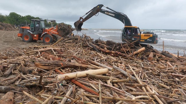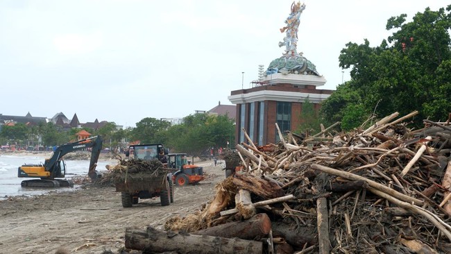 Tumpukan sampah kiriman berupa kayu mengotori area Pantai Kuta, Bali sejak Minggu (18/1) akibat cuaca ekstrem.