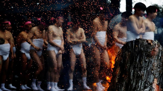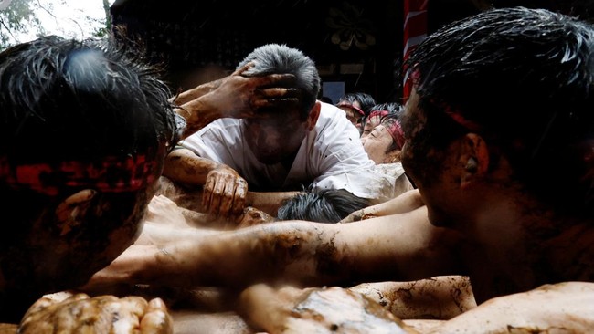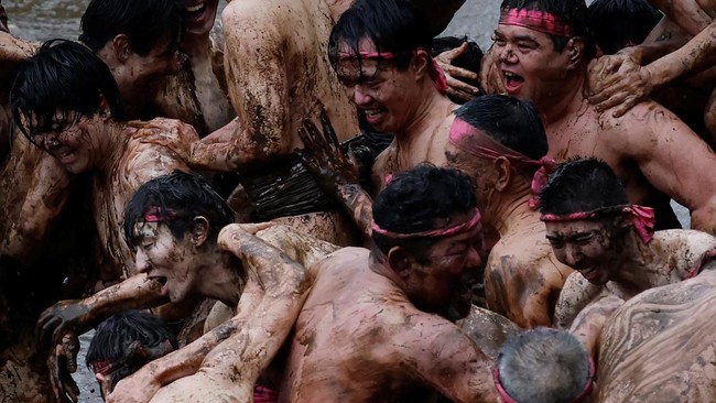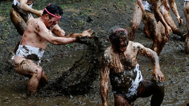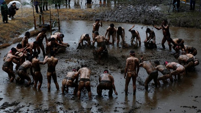 Puluhan pria Jepang bergulat di lumpur demi doa panen dan harapan bagi generasi baru dalam festival 200 tahun.