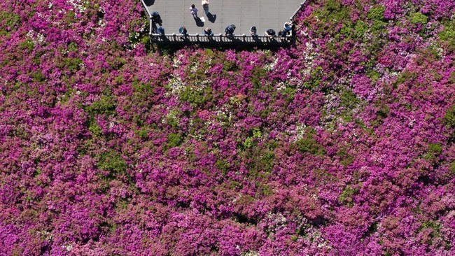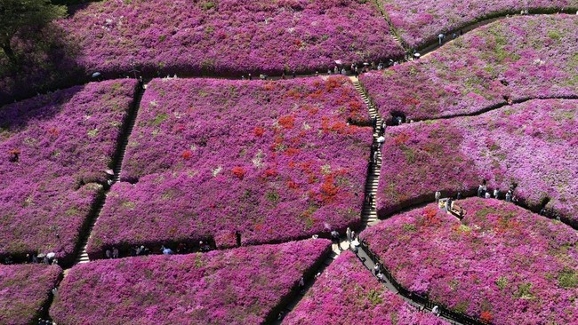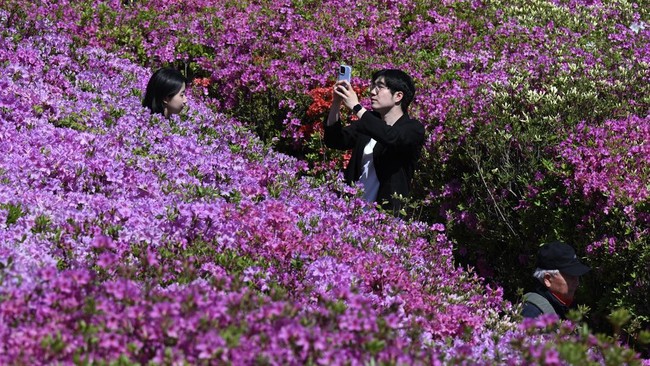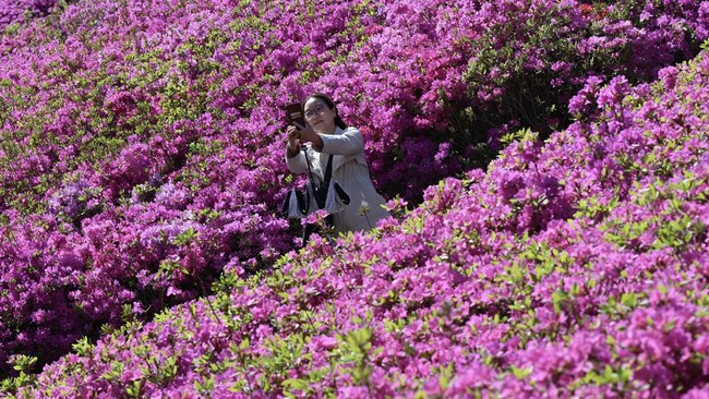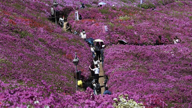 Kebun Bunga Azalea yang sedang mekar penuh selama Festival Azalea tahunan di Gunpo, Korea Selatan, Jumat (24/4), menjadi daya tarik wisatawan.
