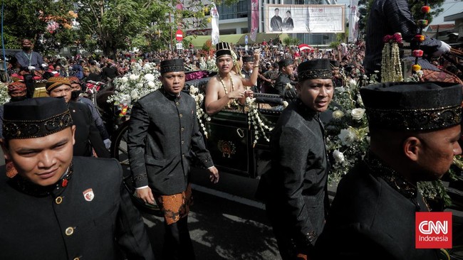 CNN Indonesia -- Salah satu rangkaian prosesi pernikahan Kaesang Pangarep dan Erina Gudono adalah kirab dengan kereta kencana dari Loji Gandrung ke Pura Mangkunegaran.