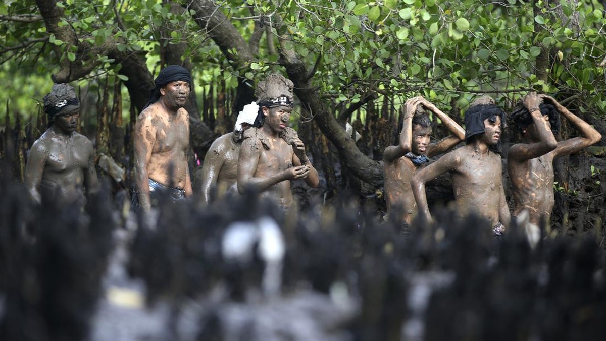 Masyarakat Desa Adat Kedonganan, Kecamatan Kuta, membalur tubuh mereka dengan lumpur pada 12 Maret 2024, atau sehari setelah Nyepi.