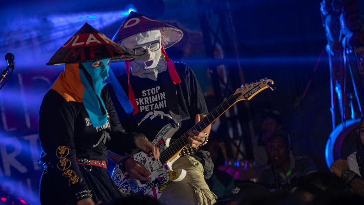 Band Sukatani tampil dalam pentas budaya Nyawiji Bumi di lereng Pegunungan Kendeng, Senin (21/4/2025). (ANTARA FOTO/Aji Styawan)