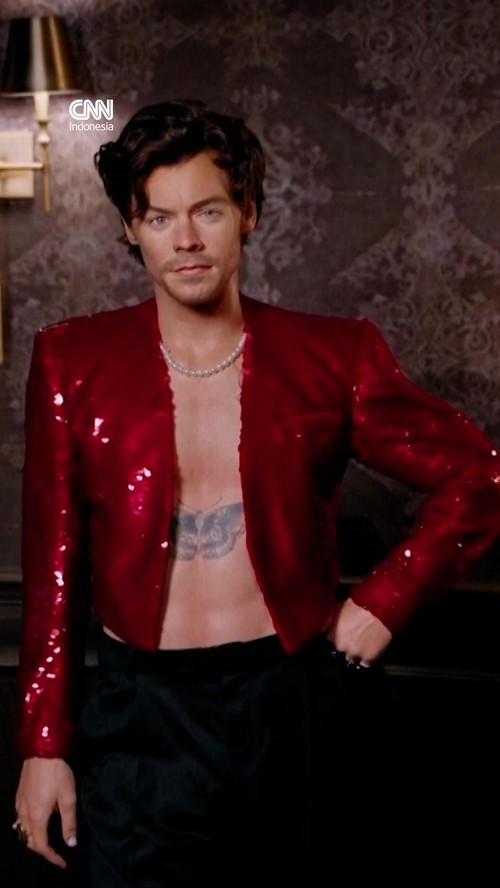 Patung itu menyerupai penampilan Harry di BRIT Awards 2023, menggunakan jaket merah bolero berkilau, celana setinggi pinggang, dan sepatu hak hitam.