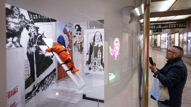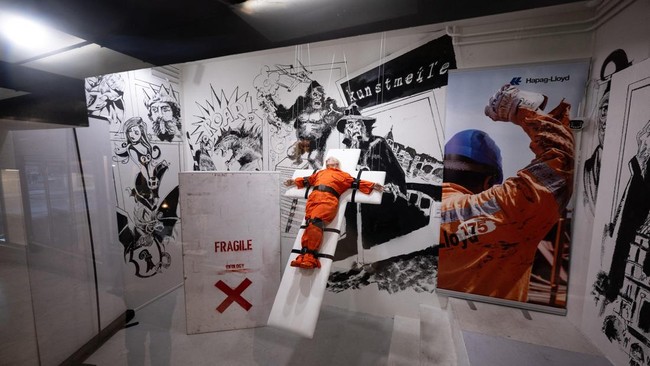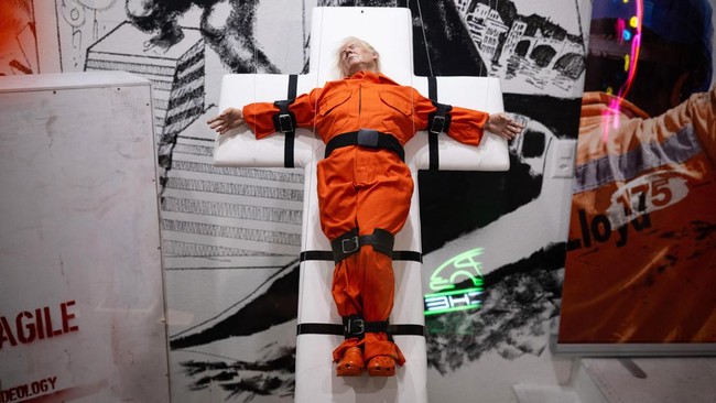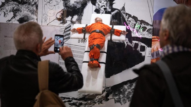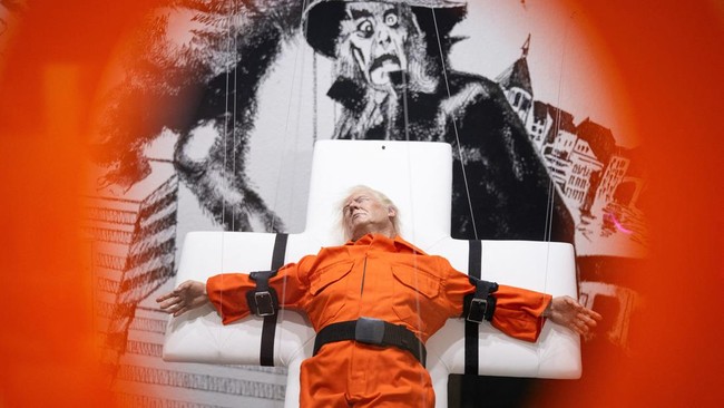 -- Patung Donald Trump disalib dengan mengenakan baju tahanan oranye dipamerkan di Basler Kunstmeile, Swiss.