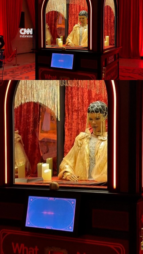 Dalam booth tersebut, aktris Teyana Taylor tampil sebagai pembaca kartu tarot di dalam sebuah bilik kaca.