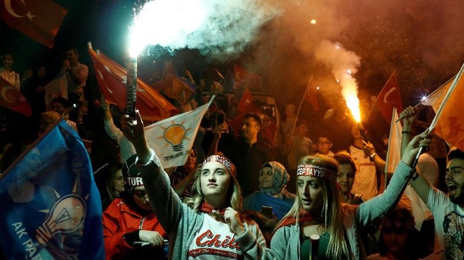 Jakarta, CNN Indonesia -- Warga Turki memadati ruas-ruas jalan, Senin (25/6) dini hari, untuk merayakan kemenangan Recep Tayyip Erdogan dan partai pimpinannya, AKP, dalam pemilu.