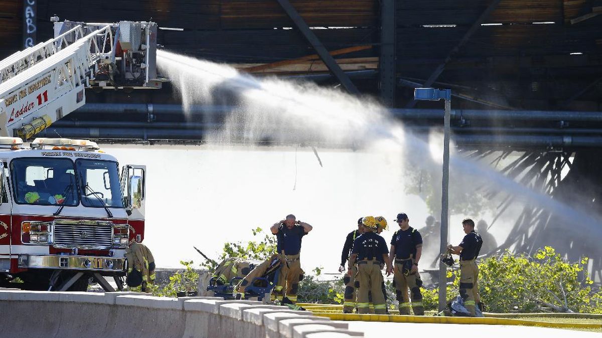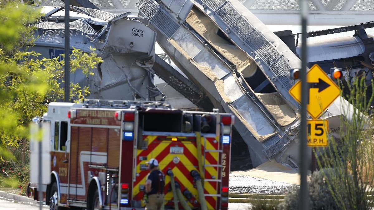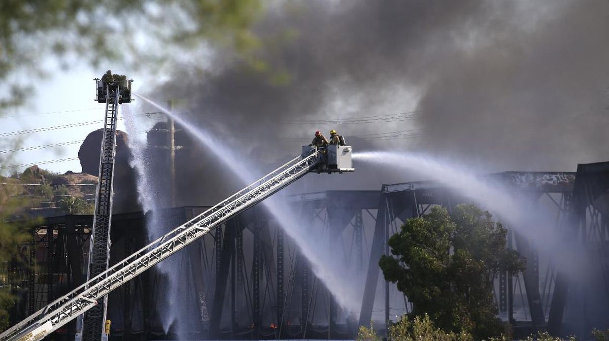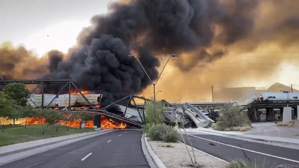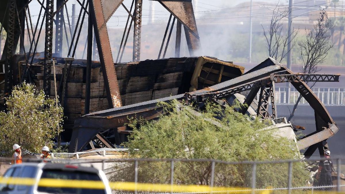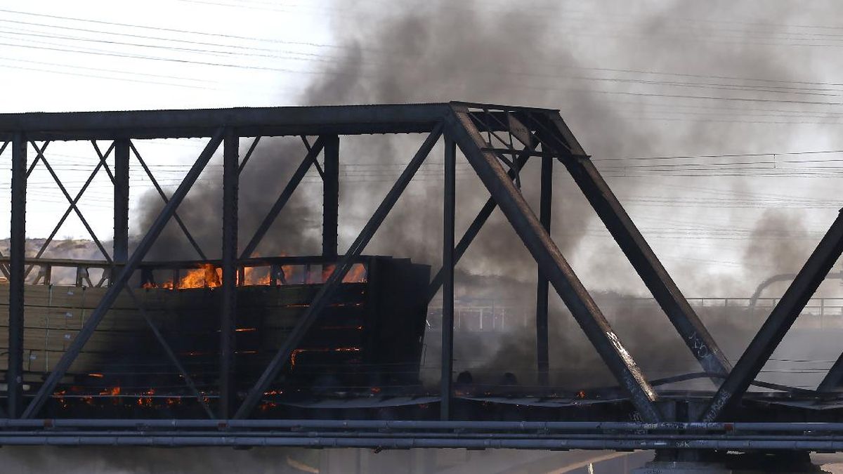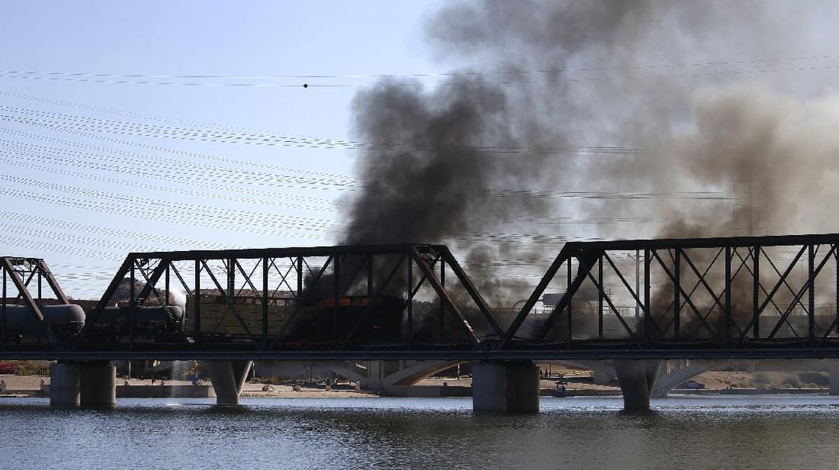 Sebuah kereta barang anjlok dan terbakar di atas jembatan danau buatan di Phoenix, Arizona, Amerika Serikat. (Daniel Coronado via AP)