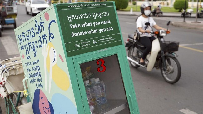 Tukang becak di Phnom Penh rela mengayuh tanpa henti di tengah terik matahari demi membagikan makanan gratis bagi warga yang kesulitan akibat pandemi Covid.