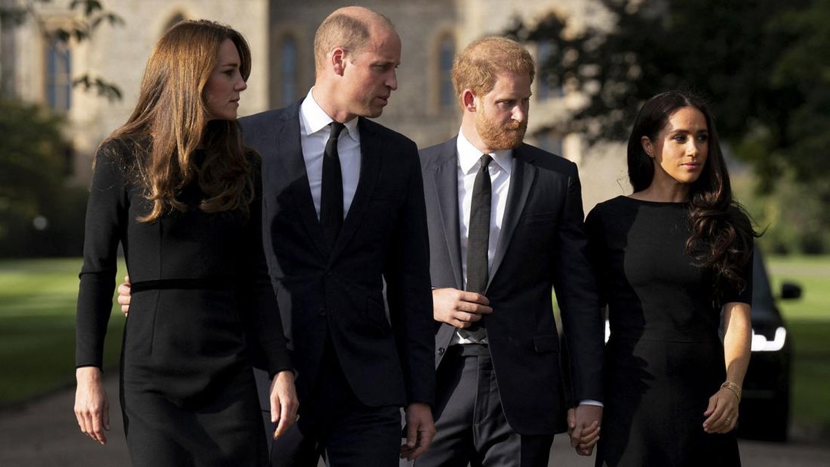 Pangeran William dan istrinya Kate Middleton serta Pangeran Harry dan isterinya Meghan Markle tampak bersama saat berkabung untuk Ratu Elizabeth II.