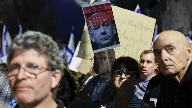 Jakarta, CNN Indonesia -- Warga Israel berunjuk rasa dengan berkumpul di luar kediaman resmi Benjamin Netanyahu di Yerusalem, Sabtu (4/11).
