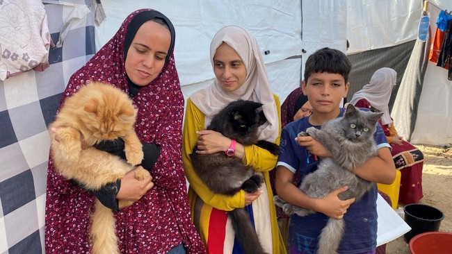 Tiga kucing menjadi pelipur lara anak-anak Palestina di tengah perang Hamas vs Israel di Gaza.