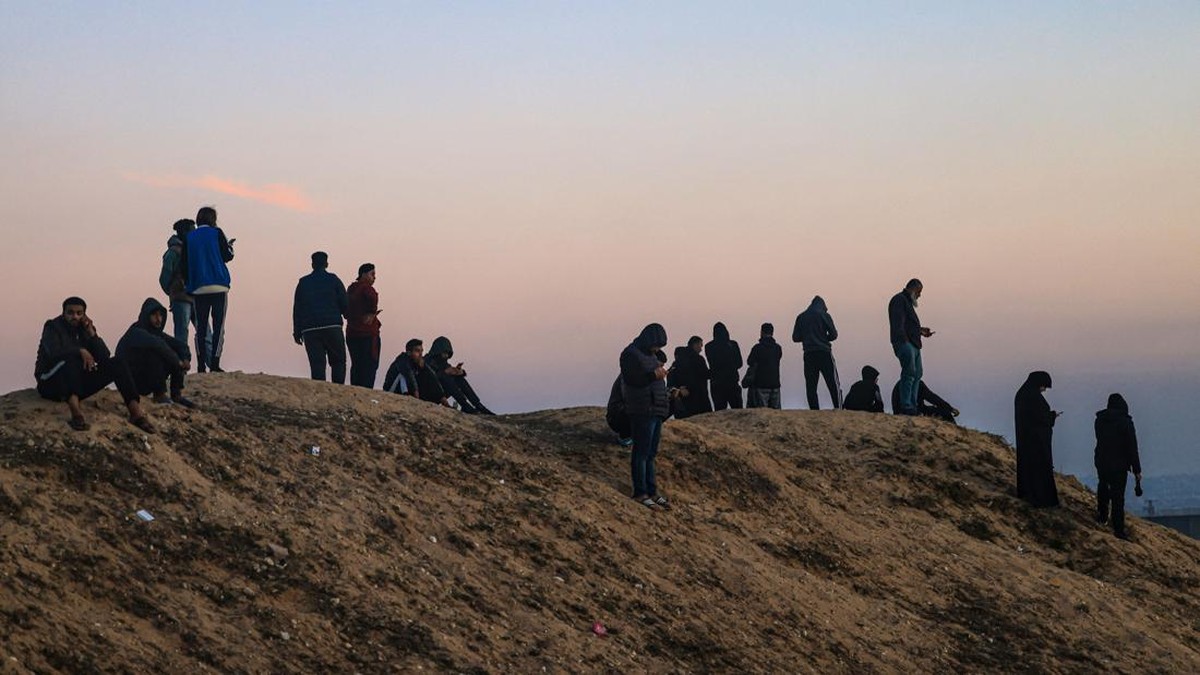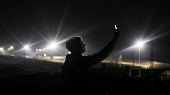 Para pengungsi Palestina akibat agresi Israel harus bersusah-payah mendaki bukit terjal demi mendapatkan sinyal handphone sekadar memastikan kabar.