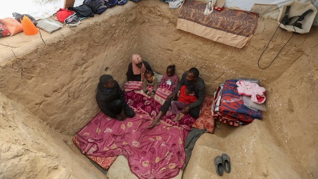 -- Warga Palestina menggali lubang di bawah tenda pengungsian demi lindungi keluarga di tengah agresi brutal Israel.