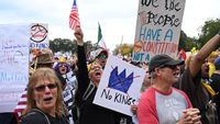Spanduk warna-warni menyerukan orang-orang "melindungi demokrasi," sementara yang lain menuntut negara menghapuskan badan Imigrasi dan Penegakan Bea Cukai (ICE) yang menjadi pusat tindakan keras antiimigran Trump.