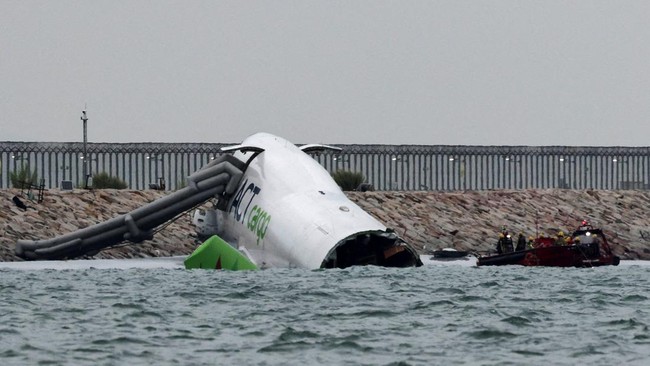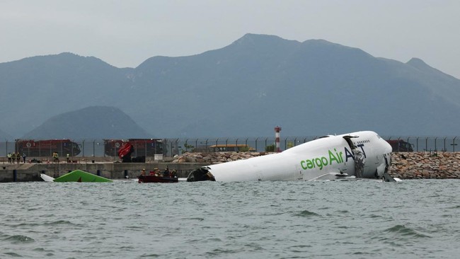 Sebuah pesawat kargo tergelincir dari landasan pacu hingga masuk ke laut saat akan mendarat di Bandara Internasional Hong Kong, Senin (20/10).