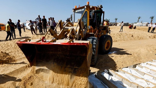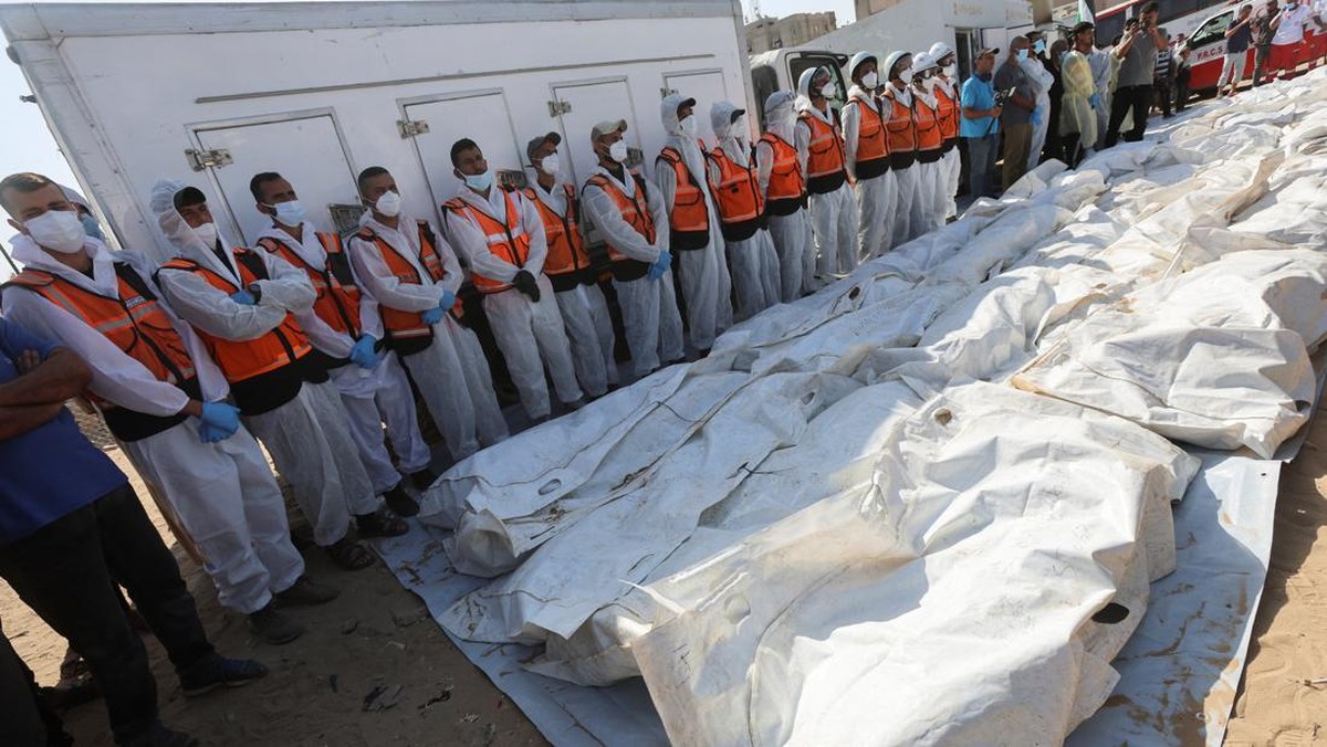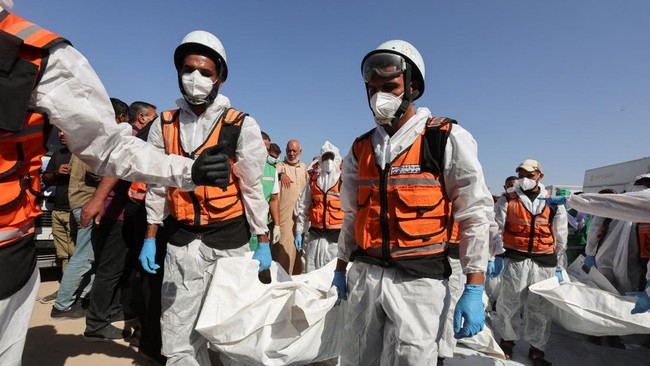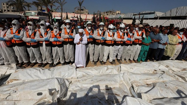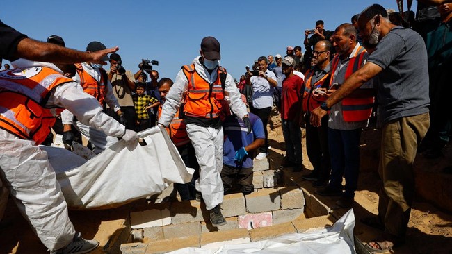 -- Warga Palestina di Khan Younis menggelar kuburan massal bagi jenazah tahanan yang dikembalikan Israel pada Rabu (22/10).