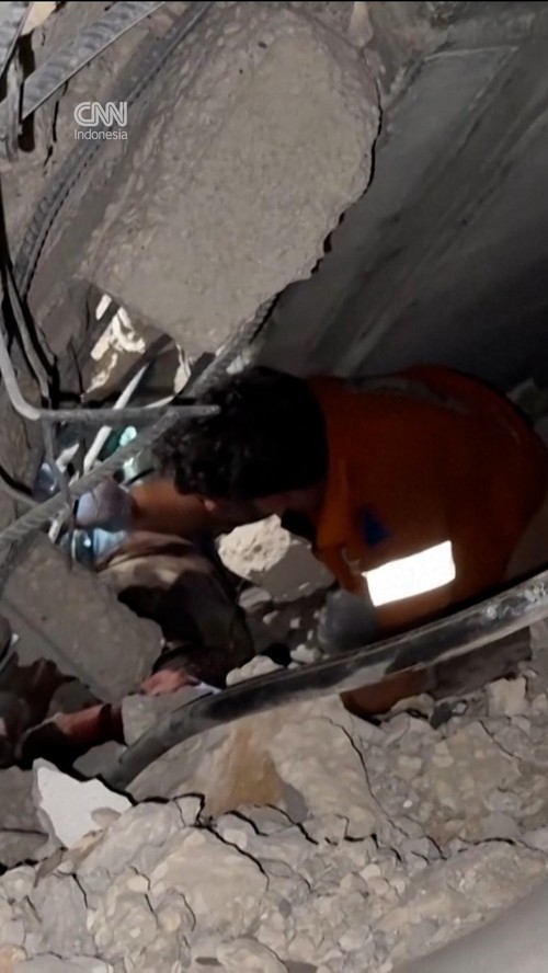 Petugas Bulan Sabit Merah Palestina mengevakuasi warga yang terjebak di bawah reruntuhan usai serangan udara Israel di Gaza, Selasa (28/10).
