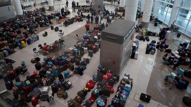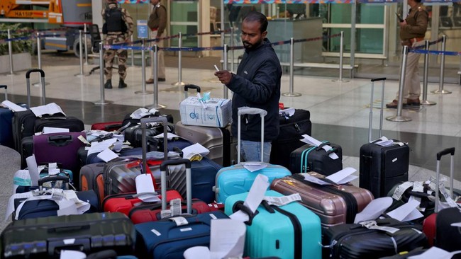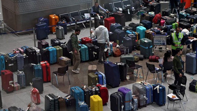 Jakarta, CNN Indonesia -- Koper dan barang bawaan penumpang maskapai IndiGo telantar setelah gangguan penerbangan skala besar, di Terminal 1 Bandara Indira Gandhi di New Delhi, India.