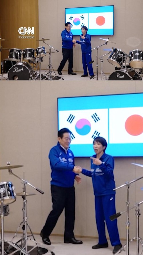 PM Jepang Sanae Takaichi dan Presiden Korea Selatan Lee Jae Myung melakukan sesi drum spontan pada Selasa (13/1).