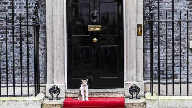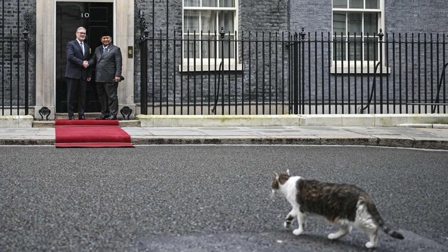LarryThe Cat 'menyambut' kehadiran Presiden RI Prabowo Subianto saat berkunjung ke 10 Downing Street, London, Inggris, Jumat (21/1).