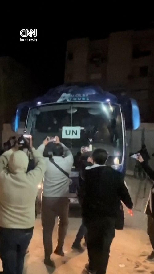 Petugas PBB turut membantu warga Palestina turun dari bus yang tiba terlambat akibat pemeriksaan keamanan oleh Israel.