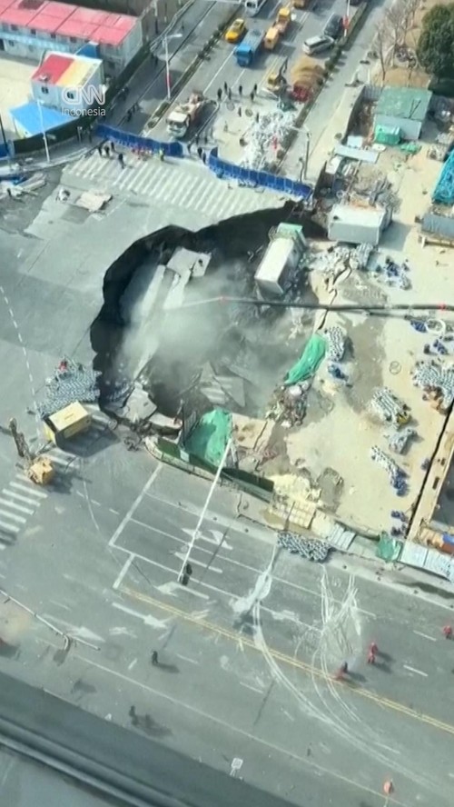 Detik-detik Sinkhole Muncul di Jalanan Dekat Proyek Metro Shanghai
