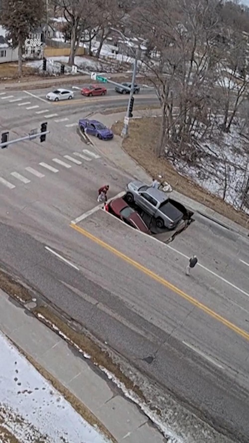 Dua kendaraan terperosok ke lubang runtuhan yang tiba-tiba muncul di persimpangan Nebraska, Amerika Serikat, pada Selasa (24/2).