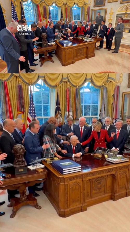 Trump duduk di meja Resolute dengan mata tertutup sementara pendeta evangelis dan televangelis mendoakan dirinya.