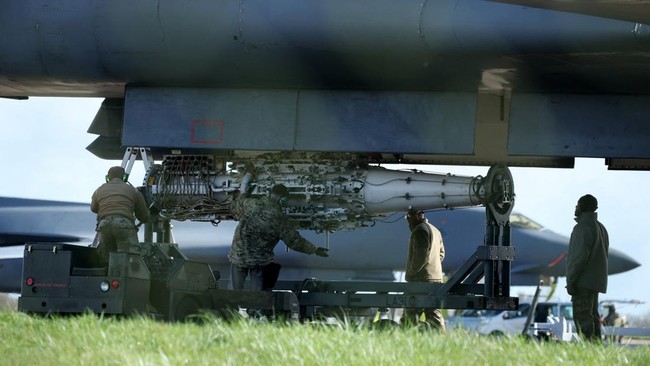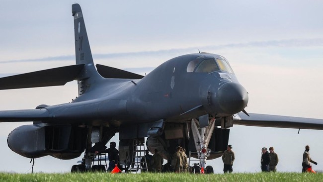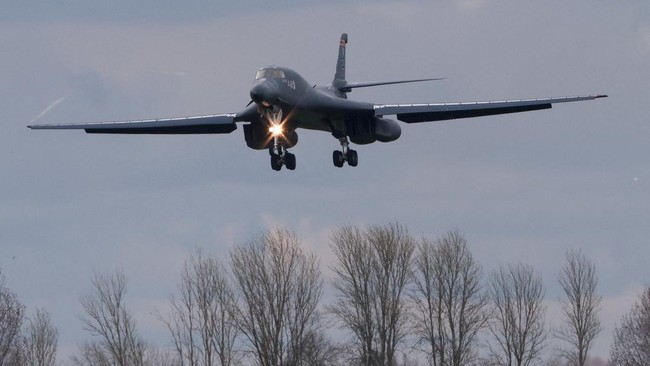Pesawat pengebom B-1B milik Amerika Serikat terlihat mendarat di pangkalan udara Fairford, Gloucestershire, Inggris