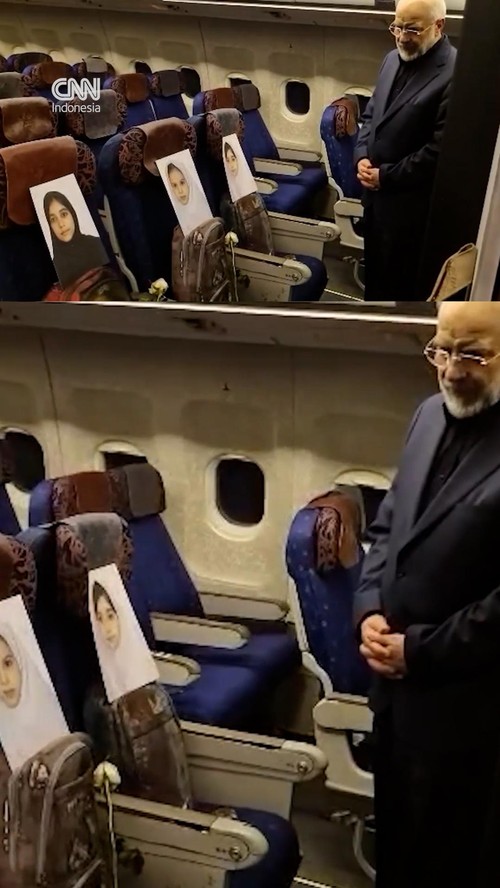 Foto anak-anak yang tewas dalam serangan AS-Israel dipajang di setiap kursi di pesawat yang membawa delegasi Iran jelang perundingan di Pakistan.