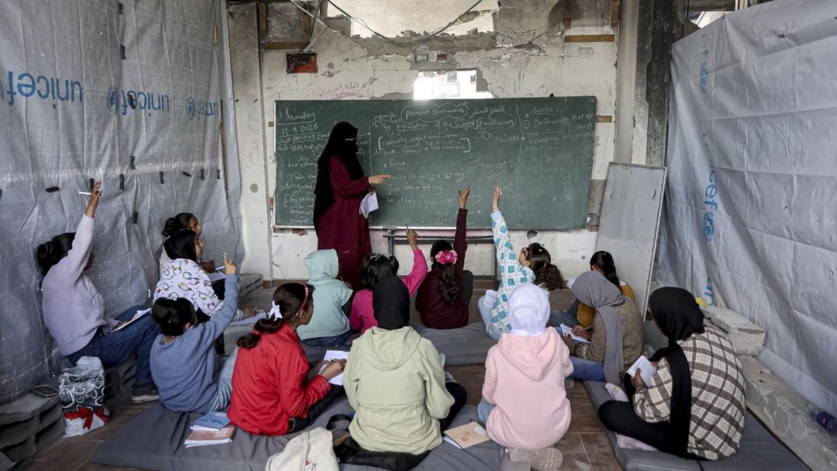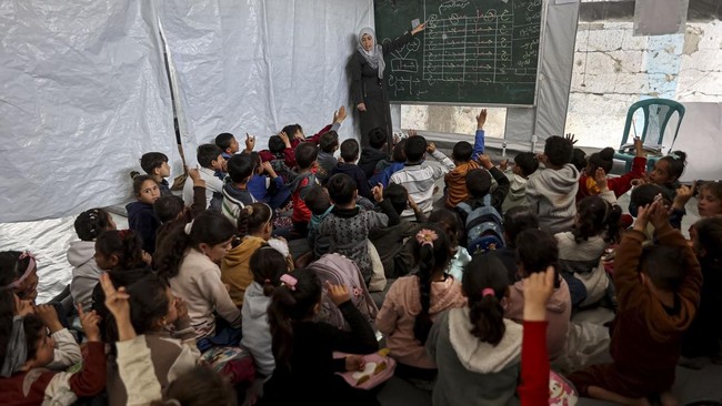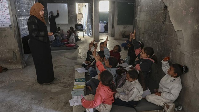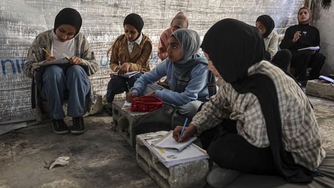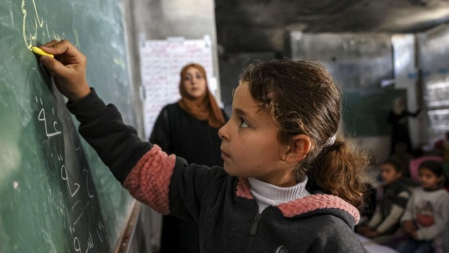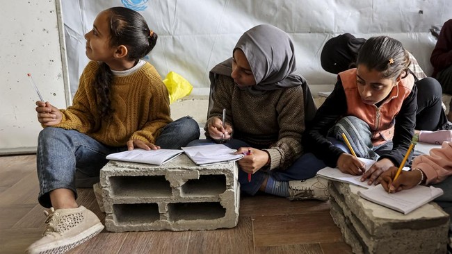 Di tengah rumah hancur pascaperang dan penjajahan Israel, anak-anak warga Palestina masih bersemangat mengemban pendidikan demi meraih mimpi di sekolah darurat.