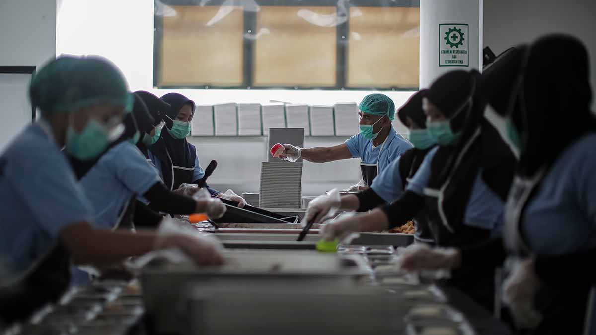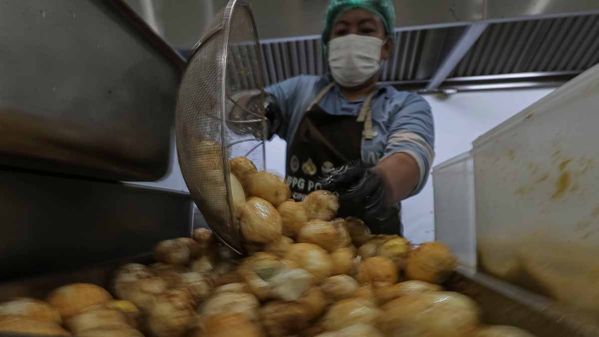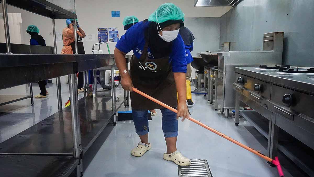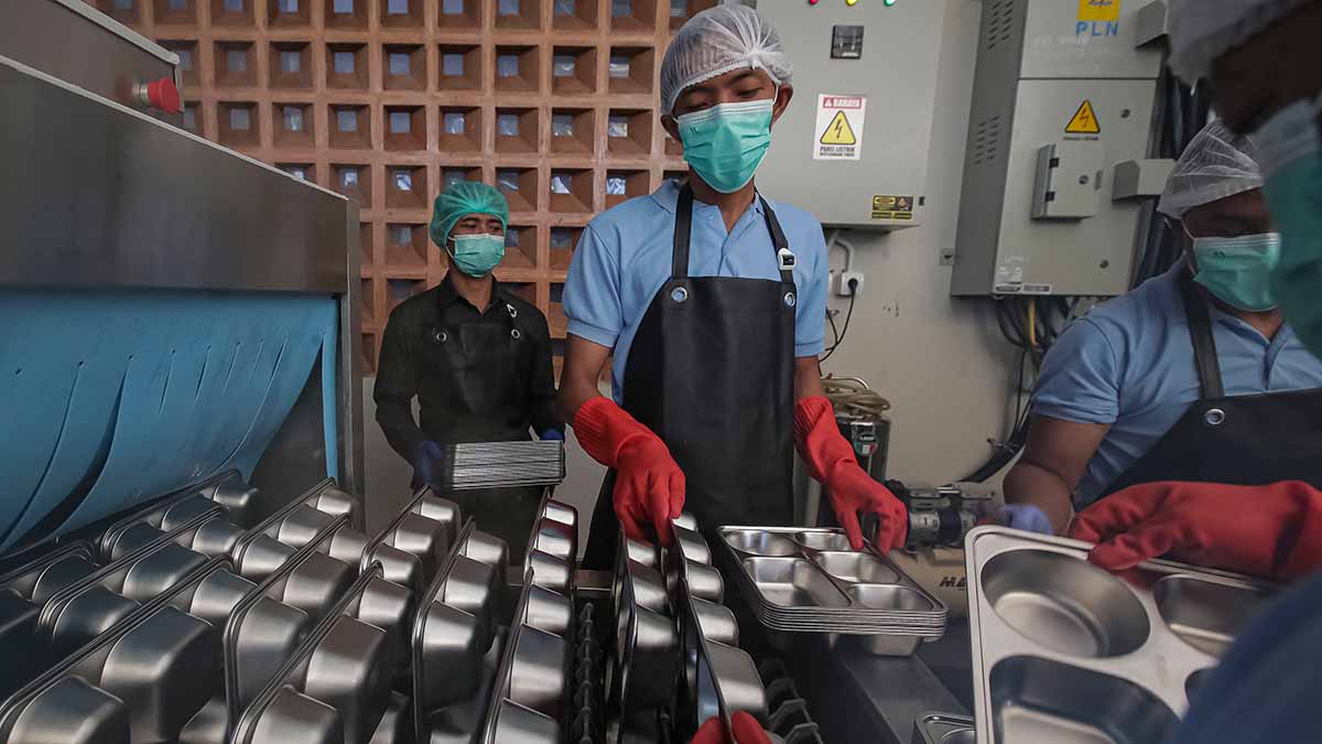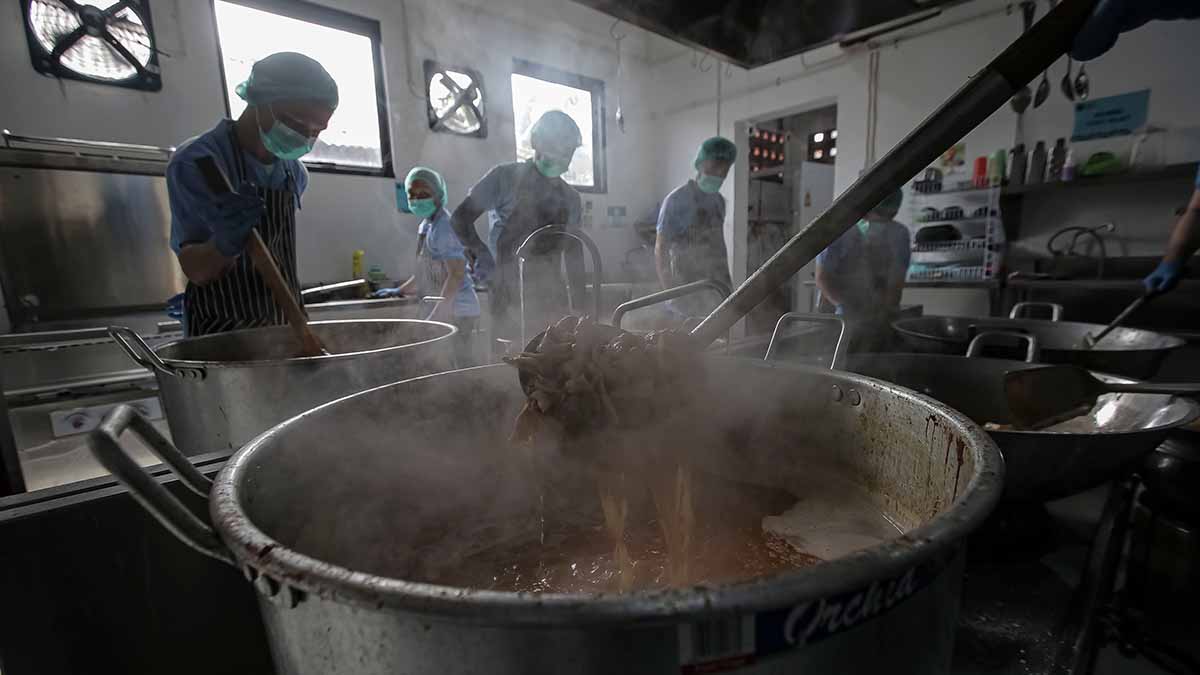 Aktivitas memasak pun berlangsung intensif, dengan juru masak mengenakan seragam, penutup kepala atau hair net, celemek, masker, dan sarung tangan. Mereka bekerja sigap memasak depan kompor dan wajan-wajan besar.