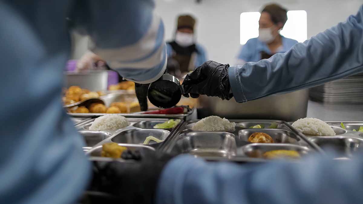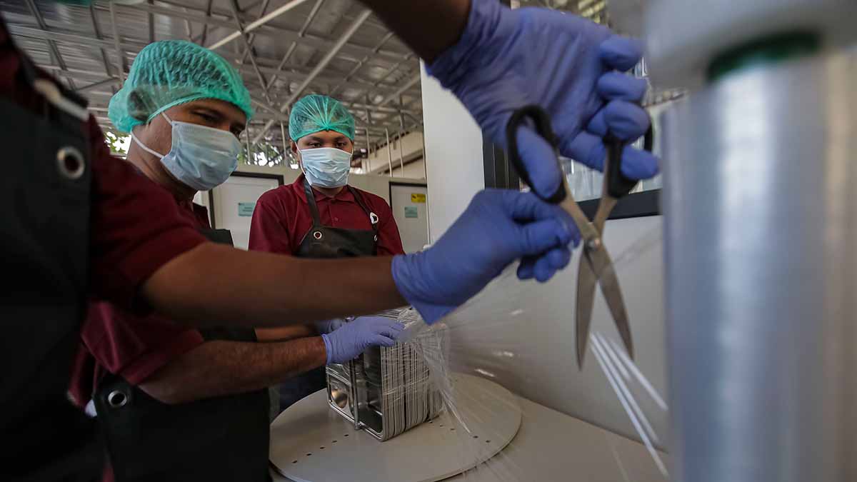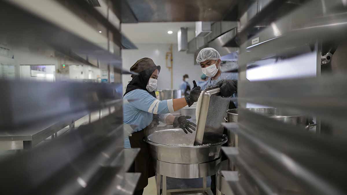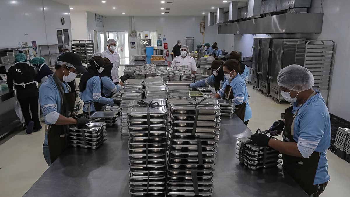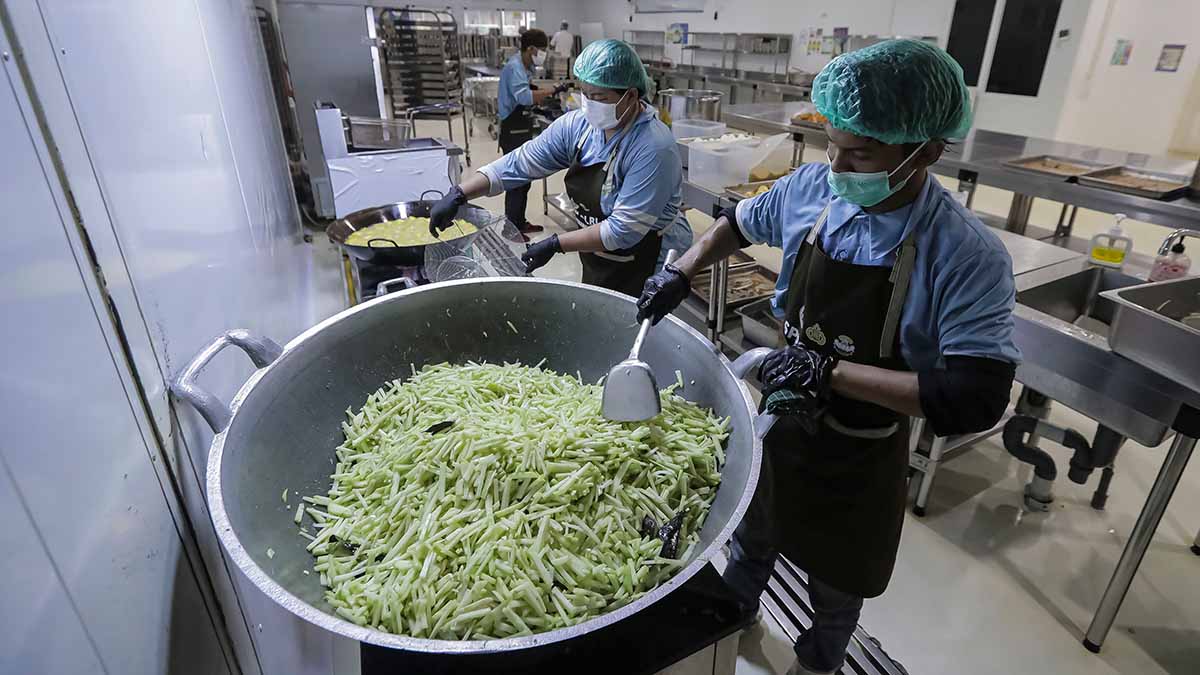 Aktivitas memasak pun berlangsung intensif, dengan juru masak mengenakan seragam, penutup kepala atau hair net, celemek, masker, dan sarung tangan. Mereka bekerja sigap memasak depan kompor dan wajan-wajan besar.