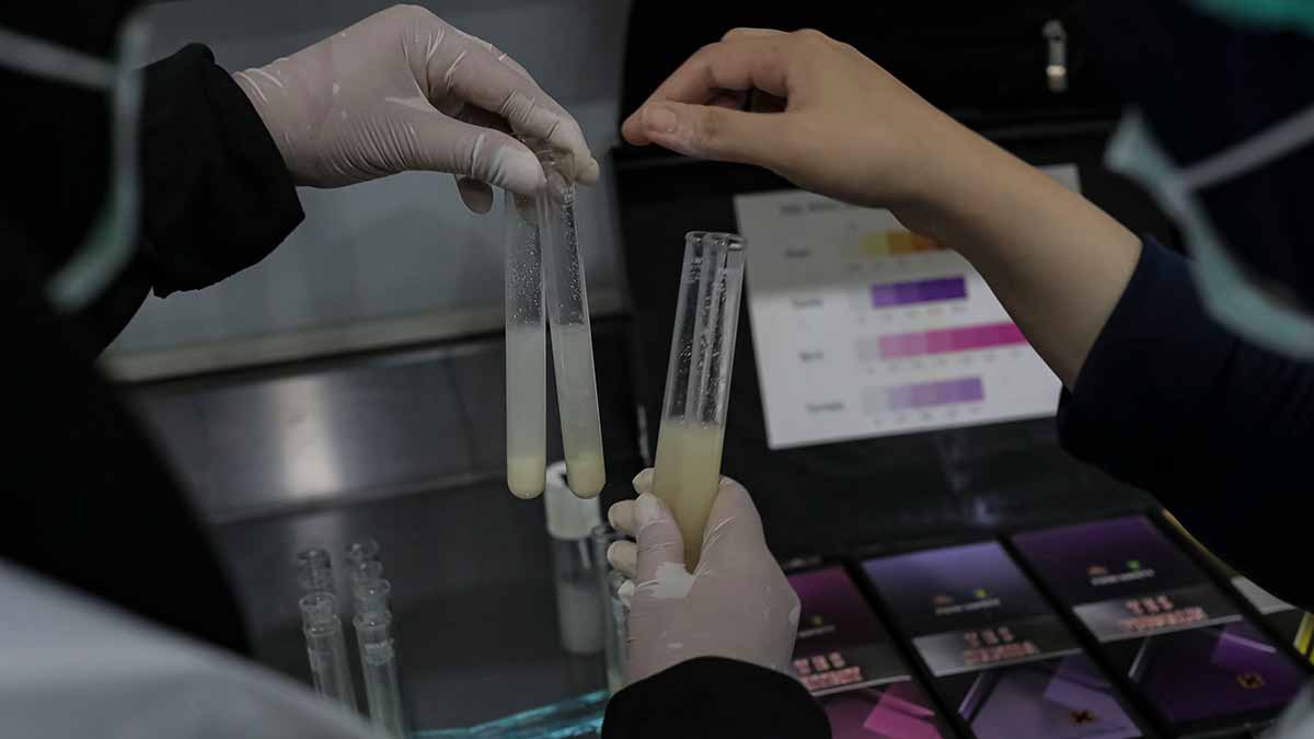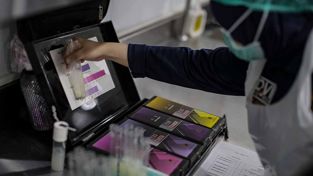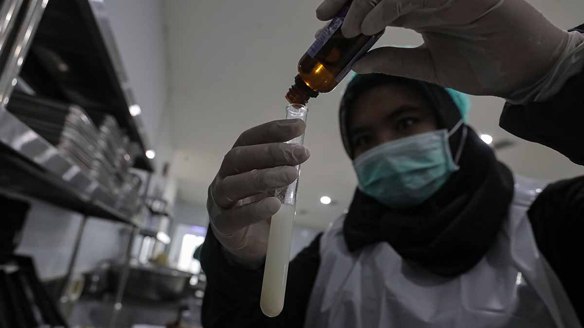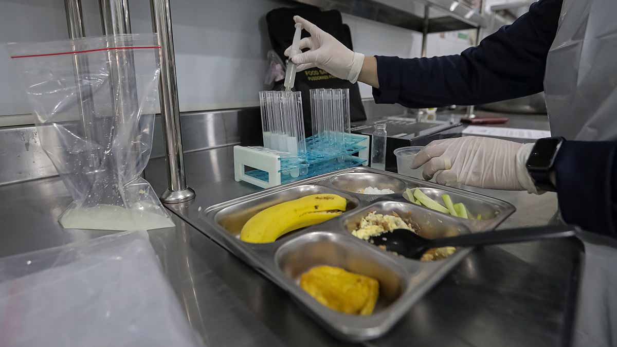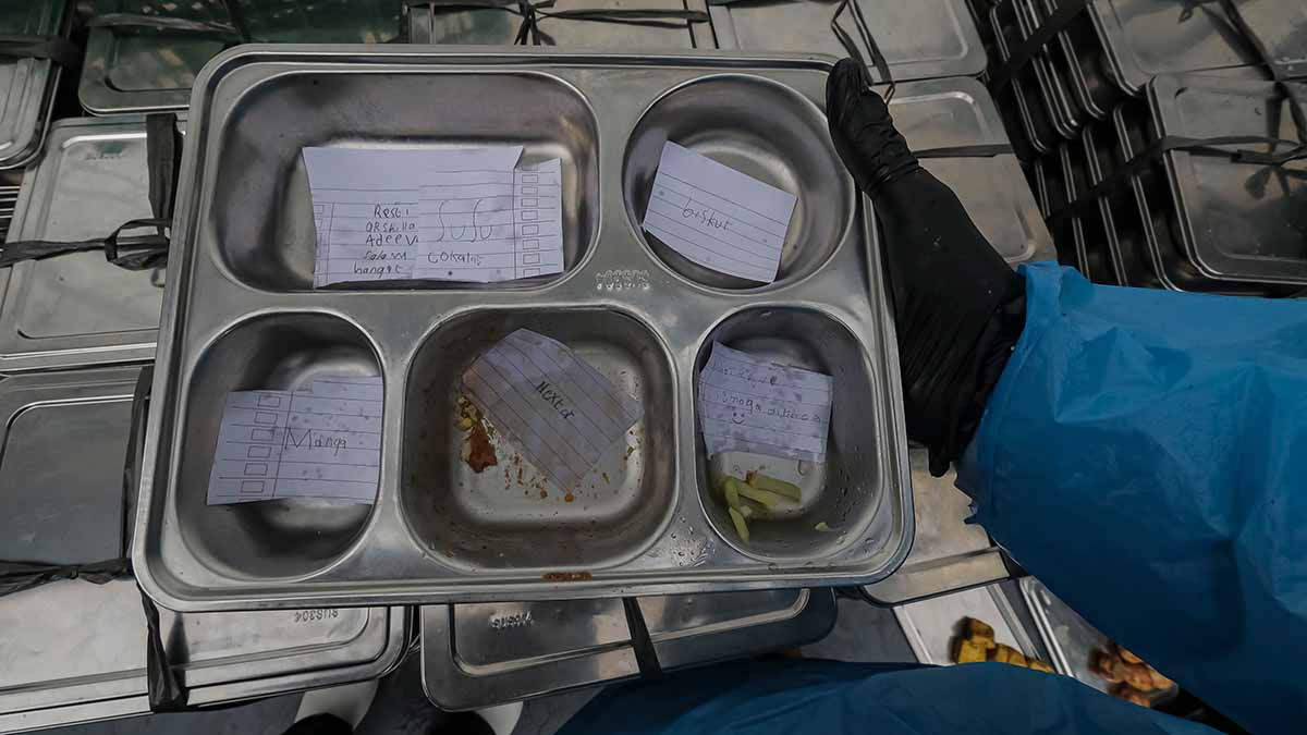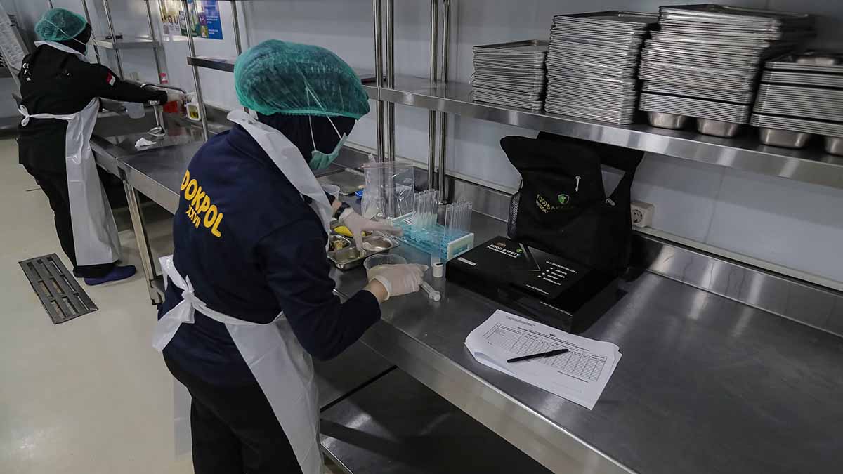 Seorang petugas Kedokteran Kepolisian terlihat melakukan pengambilan sampel makanan harian. Ia dengan hati-hati memisahkan komponen menu ke dalam nampan tersekat, dikelilingi tabung-tabung reaksi layaknya laboratorium klinis.