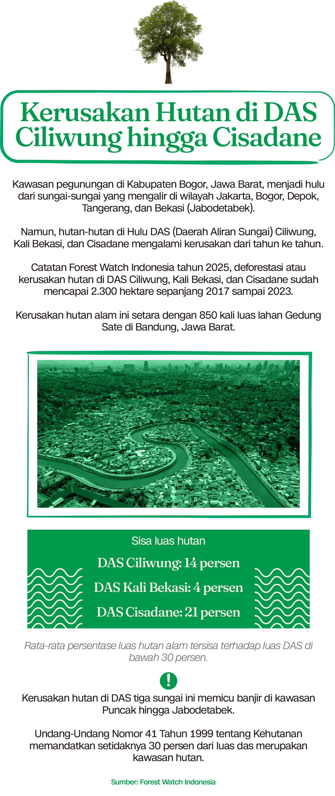 Menurut Tsabit, sisa hutan di ketiga DAS, yakni Ciliwung sekitar 14 persen, Kali Bekasi 4 persen, dan Cisadane 21 persen. Rata-rata persentase luas hutan alam tersisa terhadap luas DAS di bawah 30 persen.