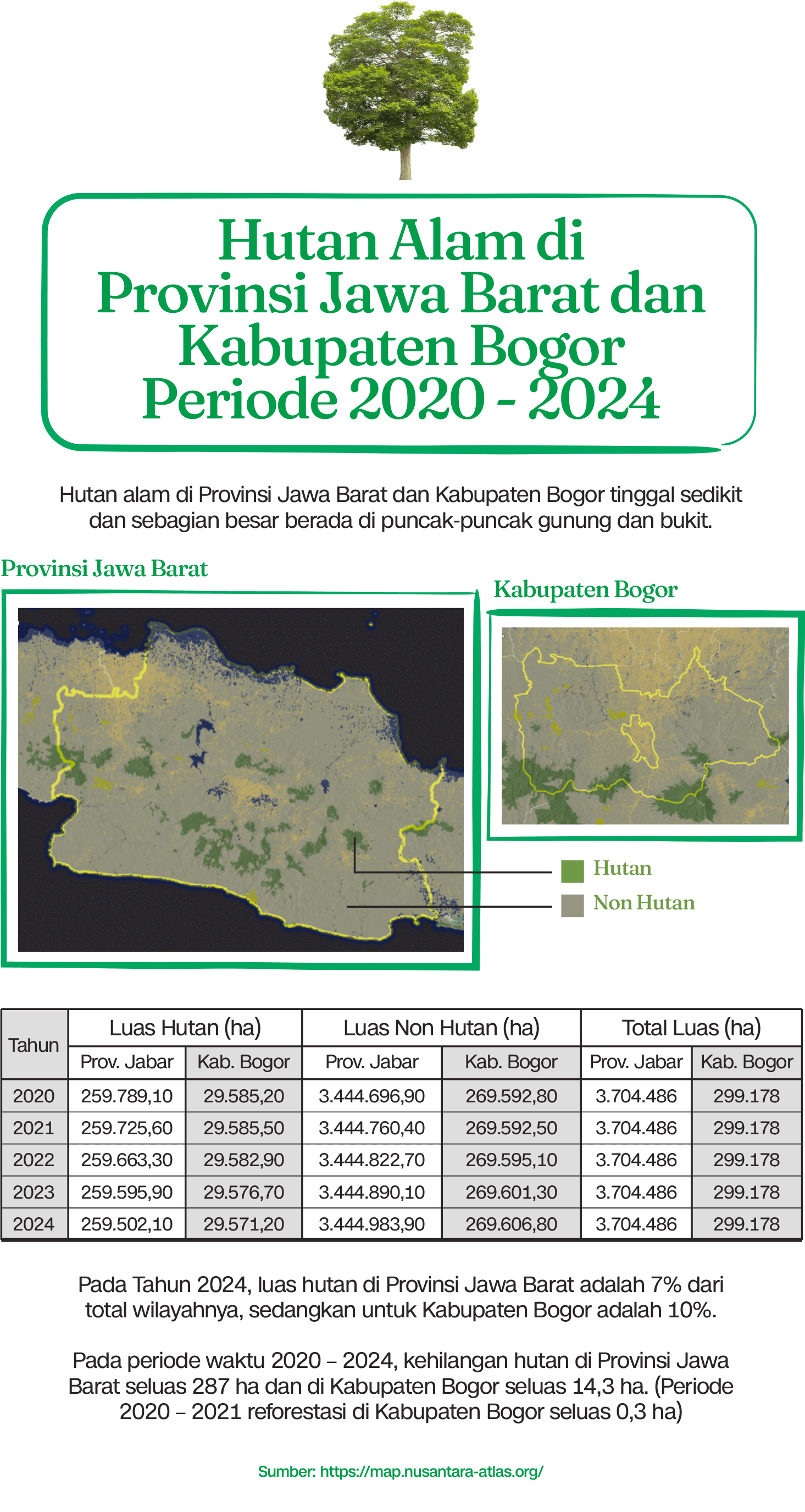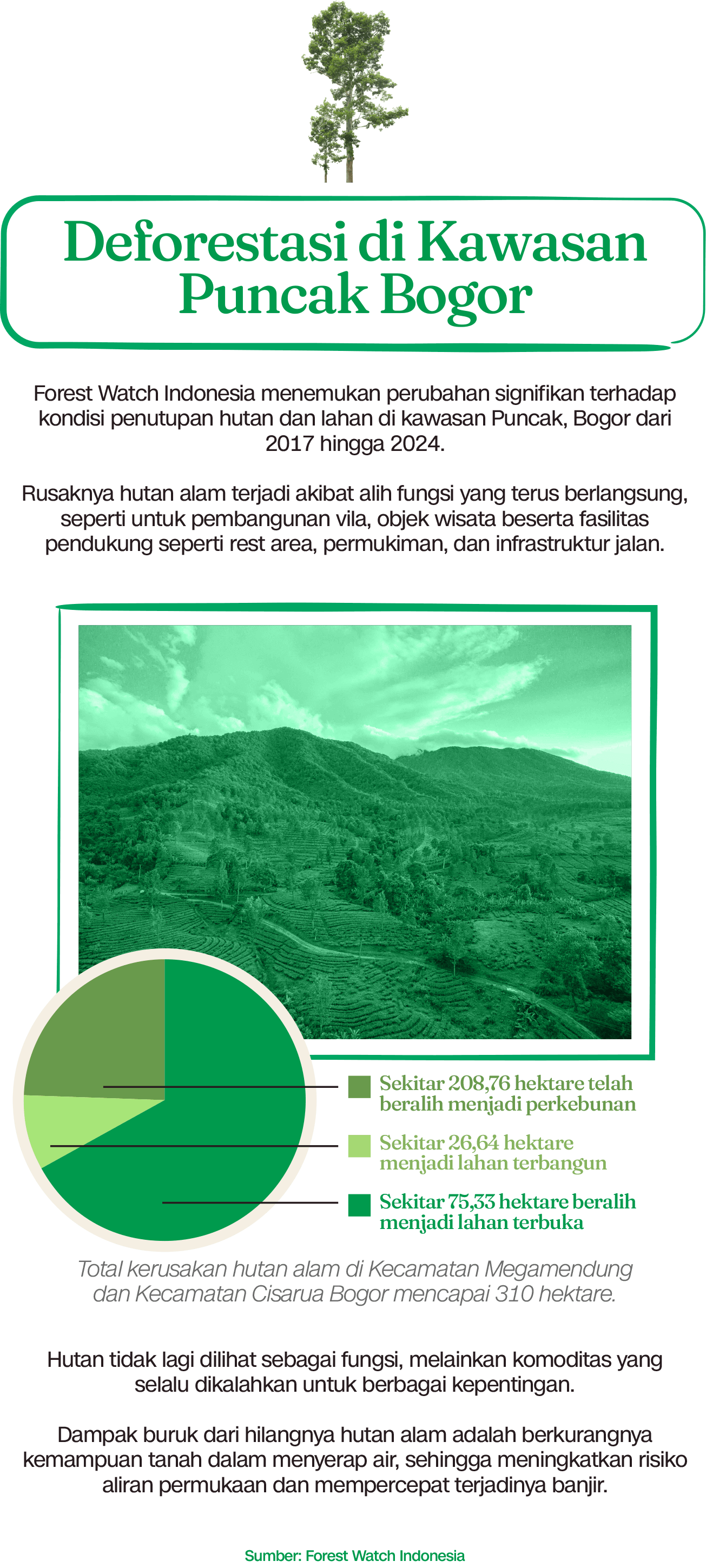 Penelitian berjudul ‘Analisis deforestasi dan perubahan tutupan lahan di Kabupaten Bogor: implikasi bagi konservasi hutan dan pengelolaan sumber daya alam’ yang terbit pada 2024 menunjukkan dalam kurun 2011–2020, Kabupaten Bogor mengalami deforestasi seluas sekitar 2.721 hektare.