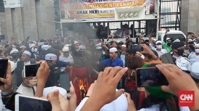 Aksi pembakaran bendera PDIP terjadi di tengah demonstrasi penolakan Rancangan Undang-Undang Haluan Ideologi Pancasila (RUU HIP) di depan Gedung DPR, Rabu (24/6) lalu.