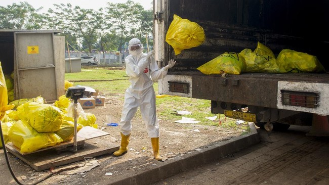 Jakarta, CNN Indonesia -- Petugas berpakaian serba tertutup berjibaku menangani limbah medis Covid-19 di RS Darurat Wisma Atlet, Kemayoran, Jakarta. Add as a preferred