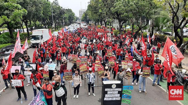 Ratusan massa aksi dari kelompok buruh, mahasiswa, dan masyarakat sipil yang tergabung dalam Gerakan Buruh Bersama Rakyat (Gebrak) memadati ruas Jalan Merdeka Selatan, Jakarta Pusat, Kamis (28/10).